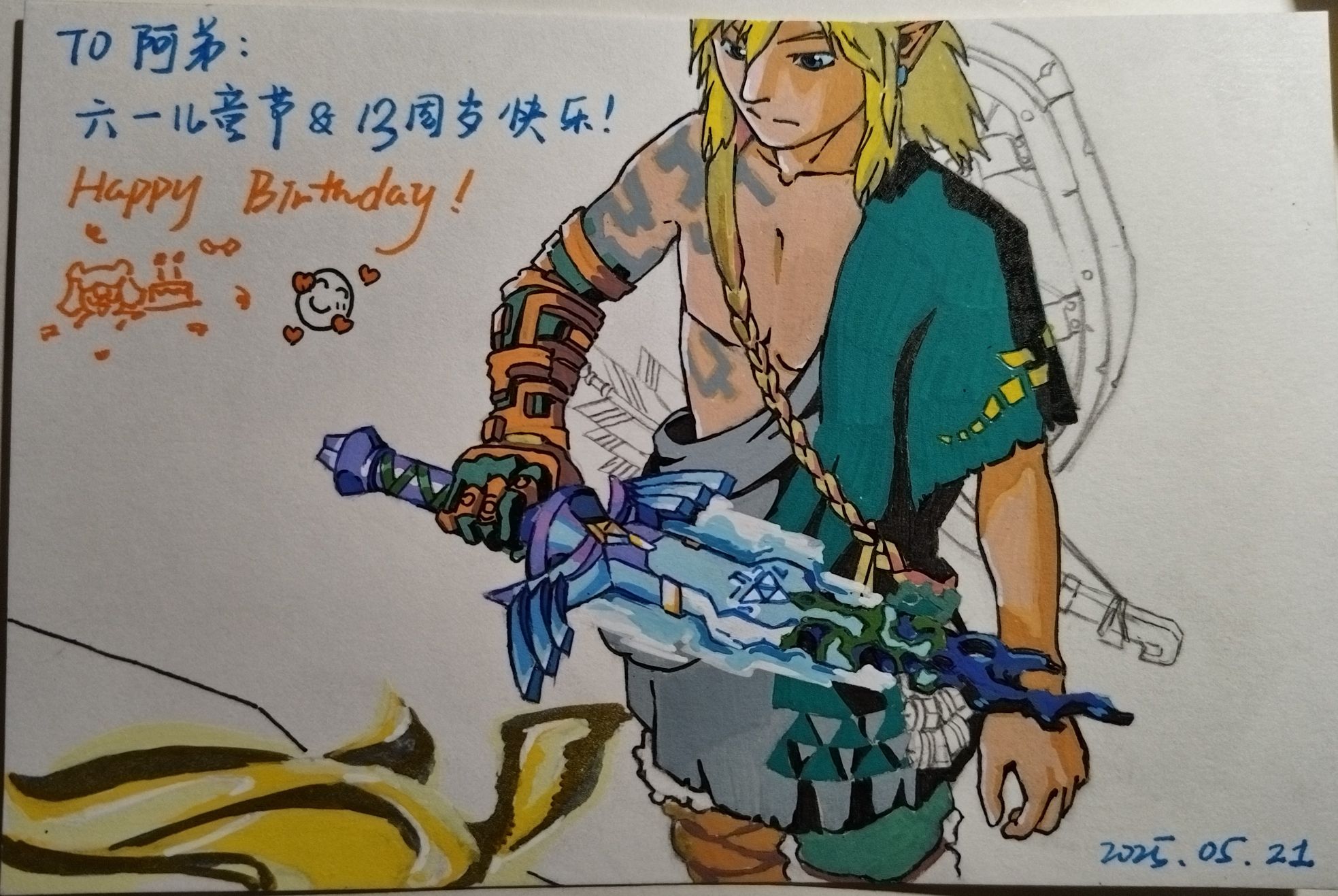 - 🥳 给家里老弟送了生日礼物!下图是我一个晚上临摹的贺卡:另外送的是王泪林克的 Amiibo 和一堆小玩意。